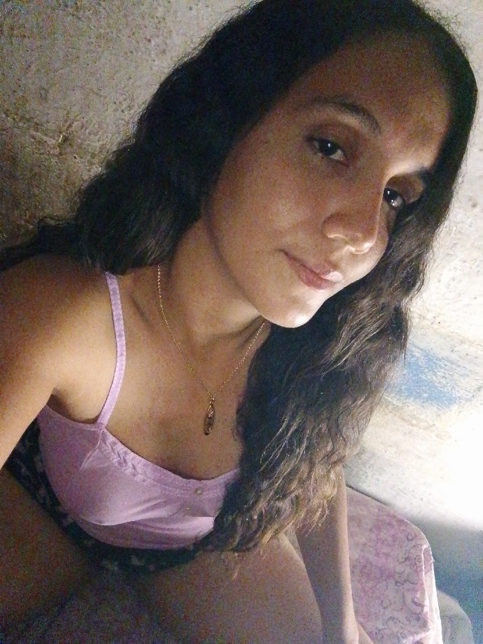 An image depicts a female individual, appearing young adult, positioned in a low-angle shot, facing generally towards the camera with a slight head tilt. She possesses long, dark, wavy hair that extends over her shoulders and chest. Her eyes are dark brown, and her lips appear full with a neutral or slight smile. She is wearing a light purple (lavender) camisole with thin straps. Around her neck, a thin gold-colored chain necklace with a small, dark, oblong-shaped pendant is visible. A dark, patterned garment, possibly a skirt or shorts, is partially visible below her camisole on the lower left side of the frame. The background consists of a textured, light-colored surface, possibly an indoor wall or ceiling, with variations in tone and some darker, possibly stained or painted areas, including a patch of light blue/grey on the upper right. On the lower right, a light-colored fabric with a subtle pattern is present, suggesting bedding or upholstery. The lighting is soft and ambient, casting minimal shadows. No discernible elements within the image provide information to ascertain a specific location in Juan Griego, Venezuela.
