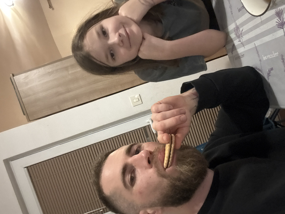 A man with a beard holds a sandwich cookie up to his mouth. He is wearing a black sweatshirt. A young girl with brown hair and a grey shirt rests her head on her hands in the background. They are sitting at a table with a lavender-patterned tablecloth. A cabinet and a light switch are visible on the wall behind them. The perspective is slightly tilted.