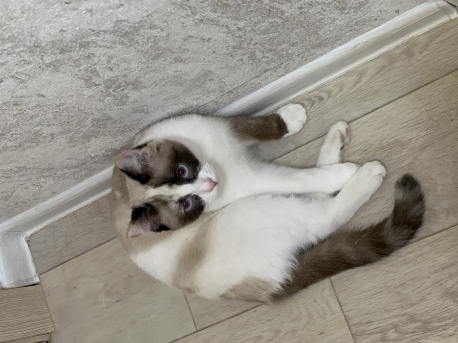 - "A Siamese cat lies on a wooden floor near a grey wall" by FM-A5lOj2, licensed under CC BY 4.0