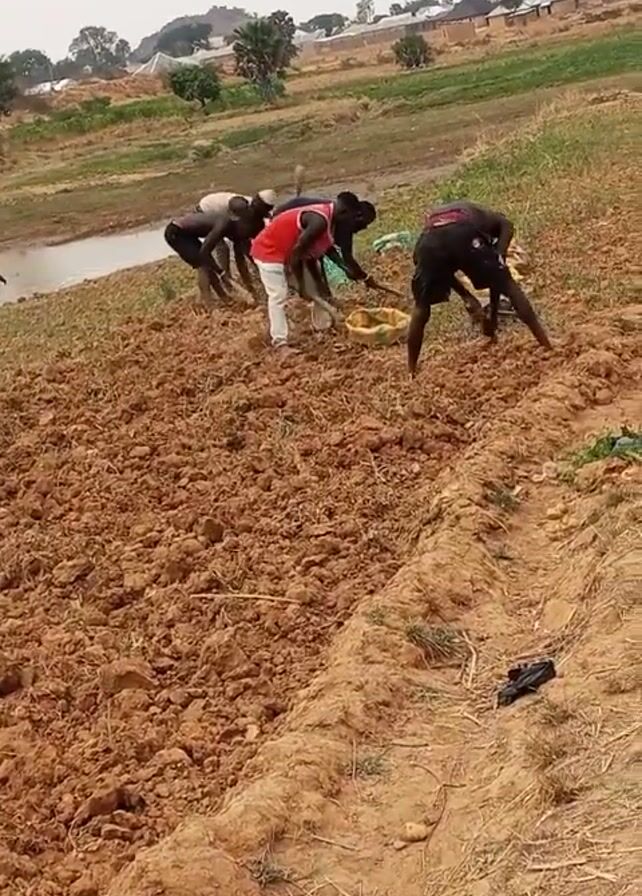 group of men working in a field near a river. The field is mostly brown soil, with some patches of grass. The men are digging in the field with tools and putting items into a yellow basket. One man is standing in the river. In the background, there are trees and some buildings. A pair of sunglasses is on the ground in the lower right corner of the frame. The sky is overcast.