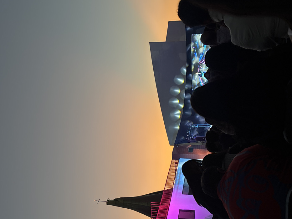 The image captures an outdoor evening scene in San Bernardino Tlaxcalancingo, Mexico, during twilight. The sky exhibits a gradient from deep orange-yellow near the horizon to a muted blue-grey overhead. On the far left, a dark, conical church spire topped with a visible cross stands, adjacent to a multi-story building section illuminated intensely with pink-magenta light, featuring a railing on its upper level. To the right and center, a large stage setup is present, featuring a prominent rectangular screen displaying a person at a podium with a microphone against a background of luminous, abstract colorful patterns. Above and around this screen, white architectural elements with circular indentations are visible. The foreground is occupied by a dense crowd of individuals, mostly seen from behind and silhouetted in dark tones, observing the stage. One person in the mid-foreground is wearing a shirt patterned with red and blue. No specific actions or interactions within the crowd are discernible beyond their collective presence as an audience.