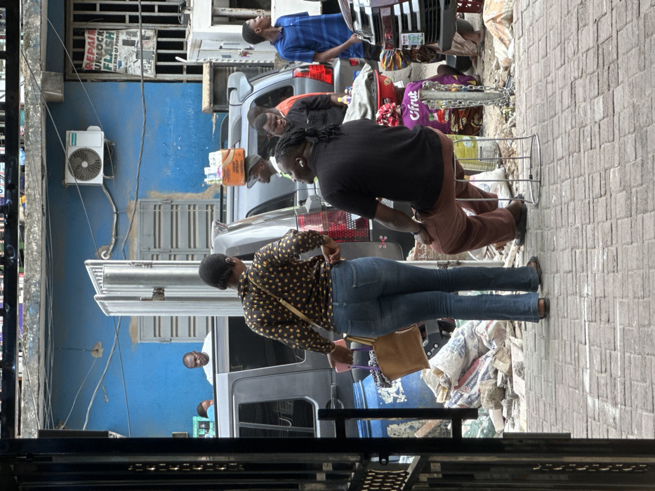 This image captures a street scene in Ikeja, Nigeria, characterized by commercial activity and multiple individuals