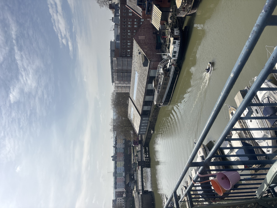 The image captures an elevated view across Bristol's Floating Harbour on a bright, partly cloudy day. In the foreground, a dark grey metal railing is visible, with an orange and a pink decorative pot hanging from it. Below the railing, several white recreational motorboats are moored in the murky green water. A small, single-person inflatable boat (dinghy or RIB) is actively moving from left to right across the water, generating a distinct white wake. Along the right bank of the harbour, a large, dark-hulled converted vessel or house-boat is moored alongside two low-rise industrial-style buildings with dark, corrugated roofs and brick exteriors. Further back, a larger multi-story red brick building with numerous windows stands, and another structure is partially covered by scaffolding. To the left, a metal bridge spans a section of the waterway. On the distant left bank, a prominent row of multi-colored terraced houses (featuring pastel blue, green, pink, and yellow facades) is visible on a hillside, characteristic of areas like Cliftonwood overlooking the harbour. Scattered bare trees and a distant construction crane are also present in the background. One individual is operating the inflatable boat.