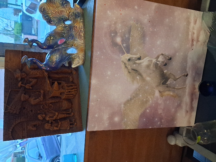 two mounted artworks. One is a dark-toned relief of workers; above it is a decorative piece shaped like two peacock heads, primarily blue with some gold. The second, larger piece displays a white unicorn leaping against a backdrop of purplish clouds and stars. Several household objects are placed on the furniture surrounding the artwork.