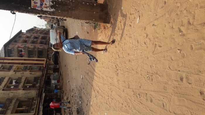 This image depicts an unpaved, sandy street scene in Onitsha, Nigeria, under bright daylight