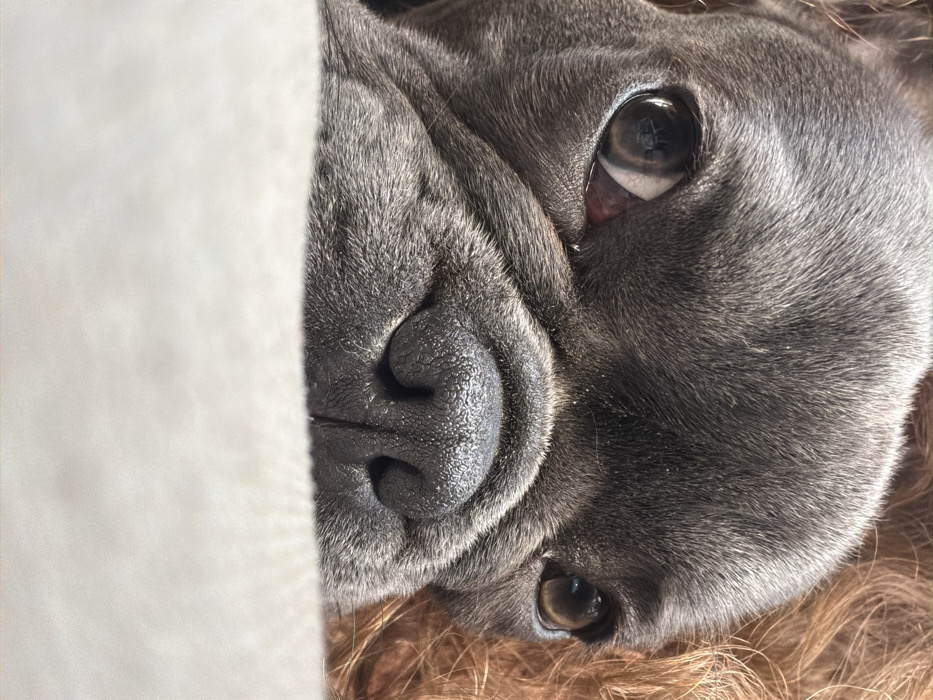A blue French bulldog is depicted upside down, its face prominently displayed with a curious gaze