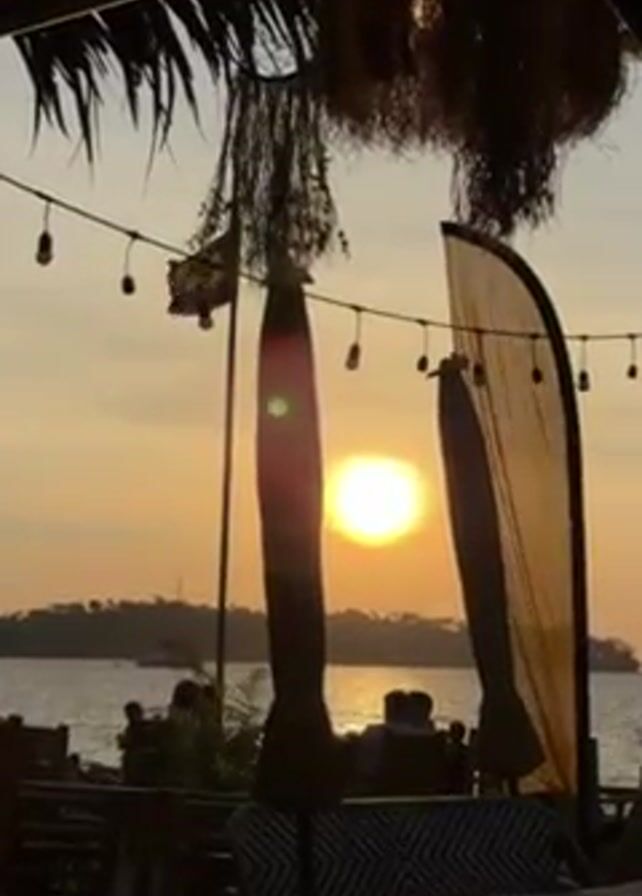 sunset from an outdoor restaurant, with a calm ocean and some small islands in the background. The sun is shining brightly, silhouetting people sitting at tables. There are palm trees and decorative hanging lights and flags.