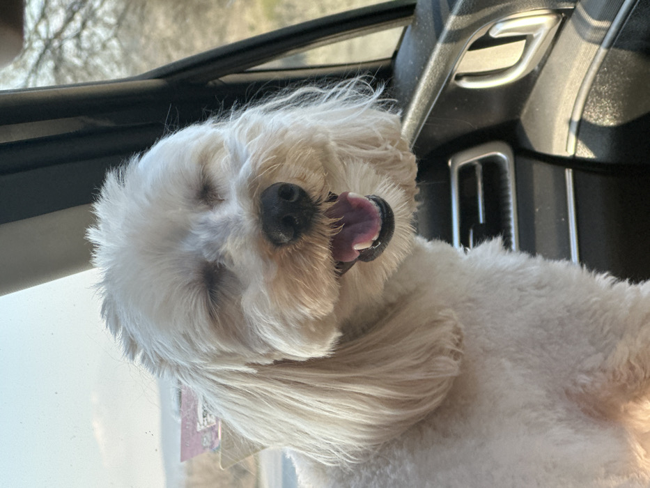 - "A white or cream-colored long-haired dog is depicted inside a vehicle, located in Mirovo, Bulgaria" by FM-RIcHm1, licensed under CC BY 4.0