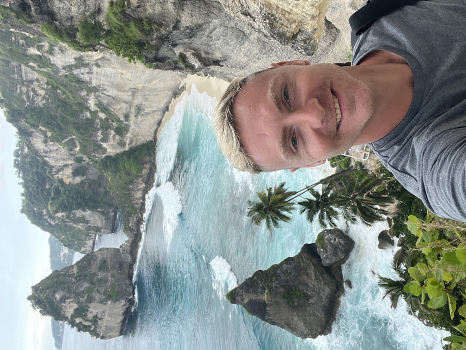 A man smiles into the camera, his blonde hair contrasting with his grey shirt. He stands on a cliff overlooking a vibrant turquoise ocean with white waves crashing against the rocks. Palm trees dot the landscape. The rugged cliffs are covered with green vegetation, and a small beach is visible in the distance.