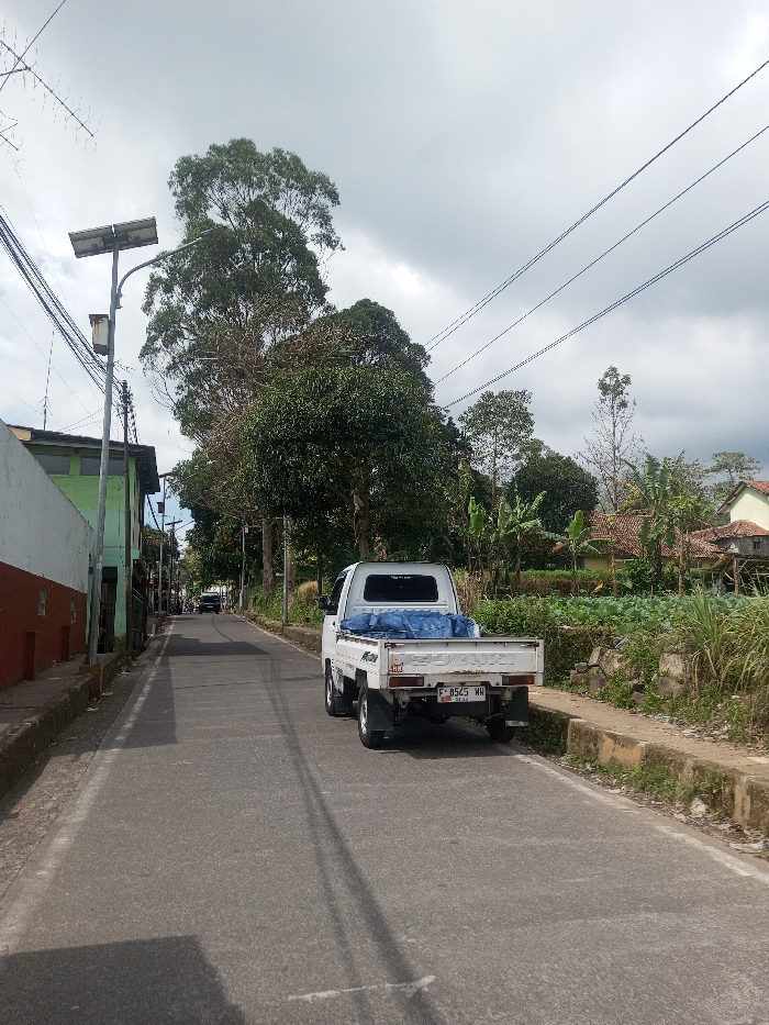 A paved, two-lane road, possibly located in Zeyathiri District, Myanmar, stretches into the background under an overcast sky. A white Suzuki pickup truck, bearing Indonesian license plate F 8525 HW, is parked on the right side of the road, facing away from the viewer. The truck's cargo bed contains a blue tarp. To the immediate left, a building with a white lower facade and a green upper section is partially visible, adjacent to a concrete wall painted white with a prominent orange-brown lower stripe. A utility pole equipped with a solar panel and a street light fixture stands near the wall. Multiple overhead power lines or communication cables are visible across the upper portion of the scene, with a television antenna structure in the upper left. To the right of the road, a raised concrete curb separates the asphalt from an unkempt verge of overgrown vegetation. Beyond this, a cultivated field of green leafy crops is present, backed by residential structures featuring reddish-brown tiled roofs. Various trees, including a banana plant, populate the background and right side of the road. No individuals are visible. The scene is illuminated by diffuse daylight.