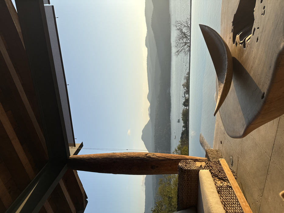 A serene landscape features a body of water, possibly a lake, with mountains in the distance, set against a clear sky. The scene is viewed from an architectural structure with visible wooden beams and supports. A sculptural wooden element resembling a crescent moon is prominently placed on a platform. The overall composition evokes a sense of tranquility and connection between the constructed environment and the natural world.