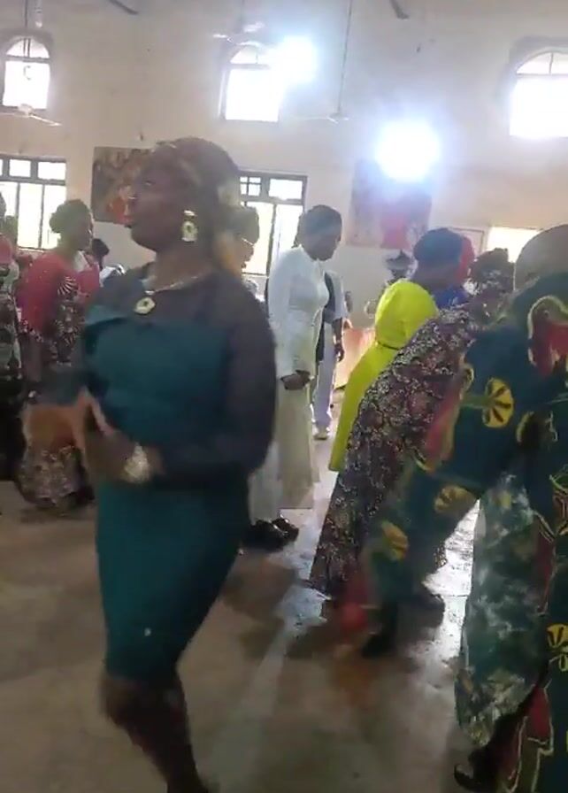group of people, mostly women, dressed in vibrant and colorful clothing, gathered in what appears to be a large, indoor space. They are moving, dancing, and generally enjoying themselves. The room is brightly lit with light coming through windows and ceiling fixtures. Some people are filming the scene with their phones. The overall atmosphere seems festive and celebratory.