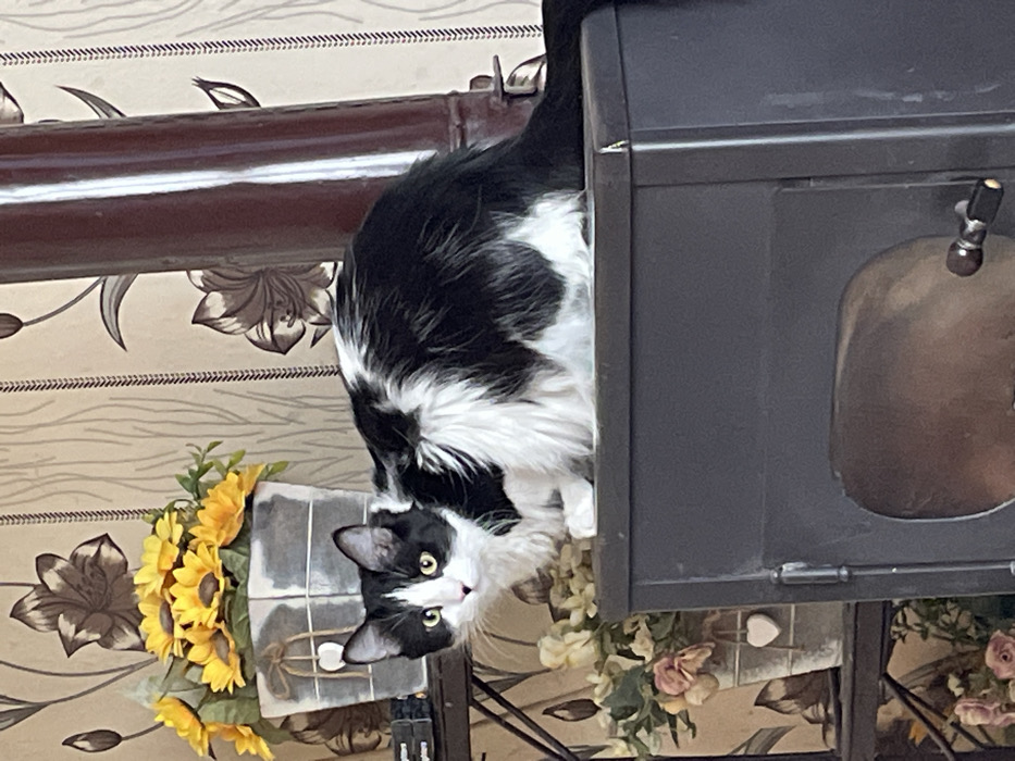 - "A black and white, medium-haired domestic cat is positioned atop a dark gray, rectangular wood-burning stove or heater in a room in the city of Troyan, Bulgaria" by FM-vu0TS2, licensed under CC BY 4.0