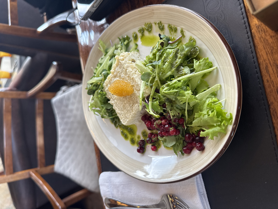 An overhead, slightly angled shot captures a single serving of food on a round, off-white plate with a patterned rim, positioned on a black placemat on a polished wooden table. The primary subject is a rectangular block of light-colored pâté or mousse, garnished with a single orange segment. Surrounding this are mixed green salad leaves, including romaine lettuce and microgreens, and a cluster of red berries, consistent with cranberries or lingonberries. A vibrant green sauce, resembling pesto or herb oil, is dotted and drizzled across the plate. To the left of the plate, a silver fork rests on a folded white linen napkin. The blurred background indicates an indoor dining environment, showcasing dark wooden chairs with upholstered seats and backs, alongside other tables and partially visible yellow drinking glasses. A dark-cased smartphone is partially visible on the table to the right. No individuals are clearly discernible. The scene depicts a meal in a restaurant or cafe setting located in Krasnoyarsk, Russia.