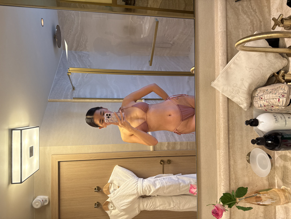 The image depicts a full-length mirror selfie taken by a female in a luxurious hotel bathroom in Antibes, France. The subject, a young adult female with dark hair pulled back, stands centered in a dusty rose two-piece string bikini. She holds a smartphone with a floral-patterned case in her raised left hand to photograph her reflection, with her right hand placed on her hip. The foreground features a light-colored marble-patterned countertop. A single pink rose in a clear glass vase occupies the left. To its right are a brass-toned soap dish with a clear insert, followed by two pump bottles of toiletries (one dark, one white). A beige canvas pouch with "DIOR" branding and a smaller patterned cosmetic bag are situated next to a prominent brass-colored faucet with cross-handle controls on the far right. The background, visible in the mirror's reflection, includes a light wood-paneled door with a brass handle on the left. Two white terrycloth bathrobes hang from brass hooks on this door. A square, flush-mounted ceiling light fixture and a white wall-mounted sensor are visible above the door. On the right, a glass shower enclosure with brass framing reveals grey, marble-patterned walls and a chrome rainfall shower head.