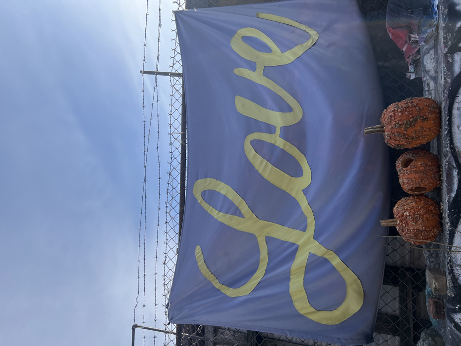 A vertical shot shows a light blue banner with the word "Love" in large, yellow script. Three orange pumpkins are arranged vertically to the right of the banner. The banner and pumpkins are hung on a chain-link fence with barbed wire at the top, set against a bright blue sky. The lower portion of the fence shows graffiti and some kind of brick.