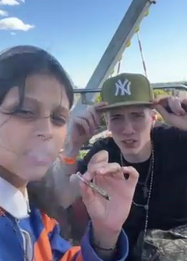 Two young adults, a female and a male, are on a Ferris wheel. The female is holding what appears to be a rolled cigarette between her lips. The male is making hand gestures. The Ferris wheel is overlooking a body of water and green trees. The sky is blue with scattered white clouds.