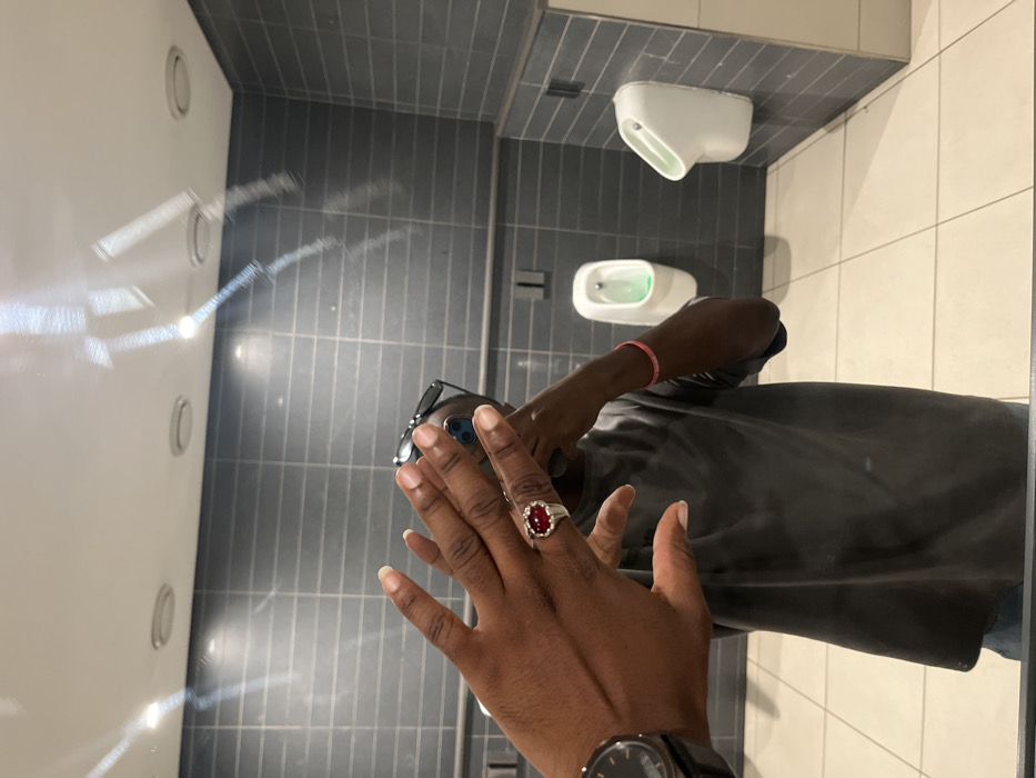 The man is wearing a silver ring with a red stone. He's in a public restroom. There's a urinal on the wall. The restroom walls are tiled gray, and the floor is tiled white. There are shadows on the wall. He's wearing a black t-shirt, a pink bracelet and a black wristwatch. He is also wearing sunglasses.