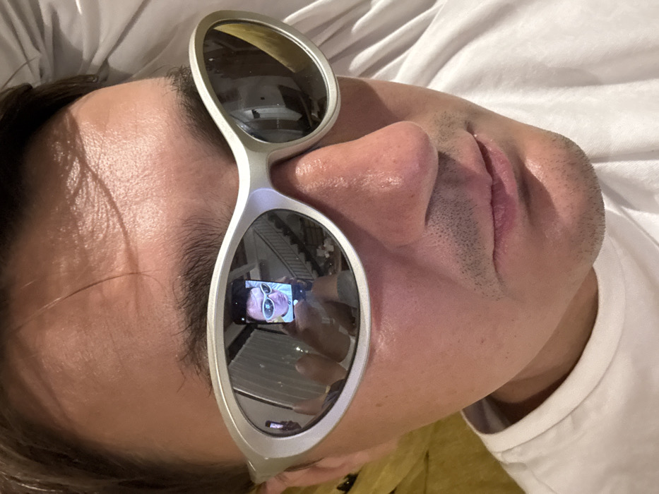 A male subject is depicted in a close-up, slightly overhead view, reclined against a white surface, likely bedding. He wears a white crew-neck t-shirt and silver-framed, mirrored wraparound sunglasses. The subject has dark hair and visible stubble on the upper lip and chin. The left lens of the sunglasses clearly reflects a smartphone screen displaying a selfie image of the subject wearing identical sunglasses, held by the subject's left hand. The right lens reflects an indoor environment, specifically a white staircase with dark railings ascending to the right. The scene is located indoors in Jimbaran, Indonesia.