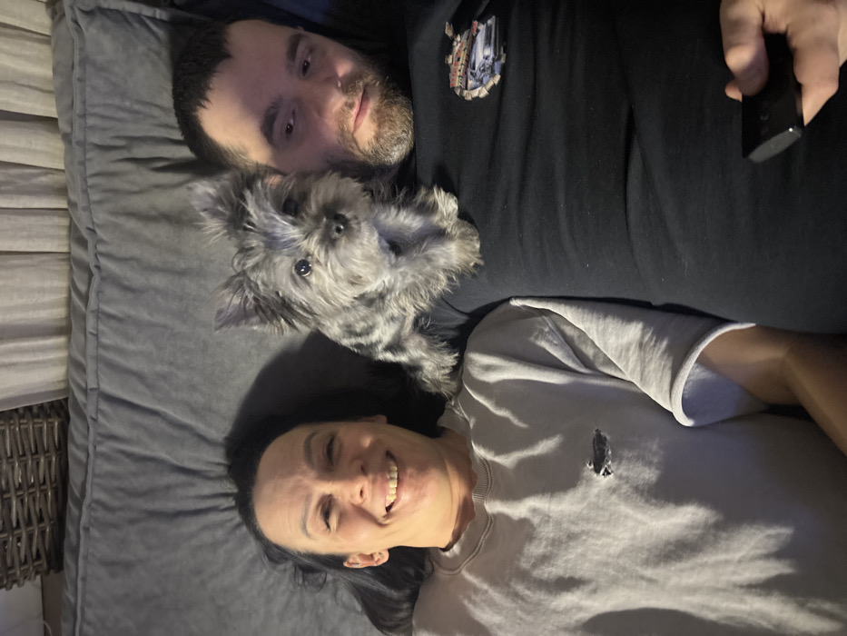 - "An overhead view depicts two individuals and a dog lying on a grey upholstered surface within an indoor domestic setting in Chaikovsky, Russia" by FM-kirZf2, licensed under CC BY 4.0