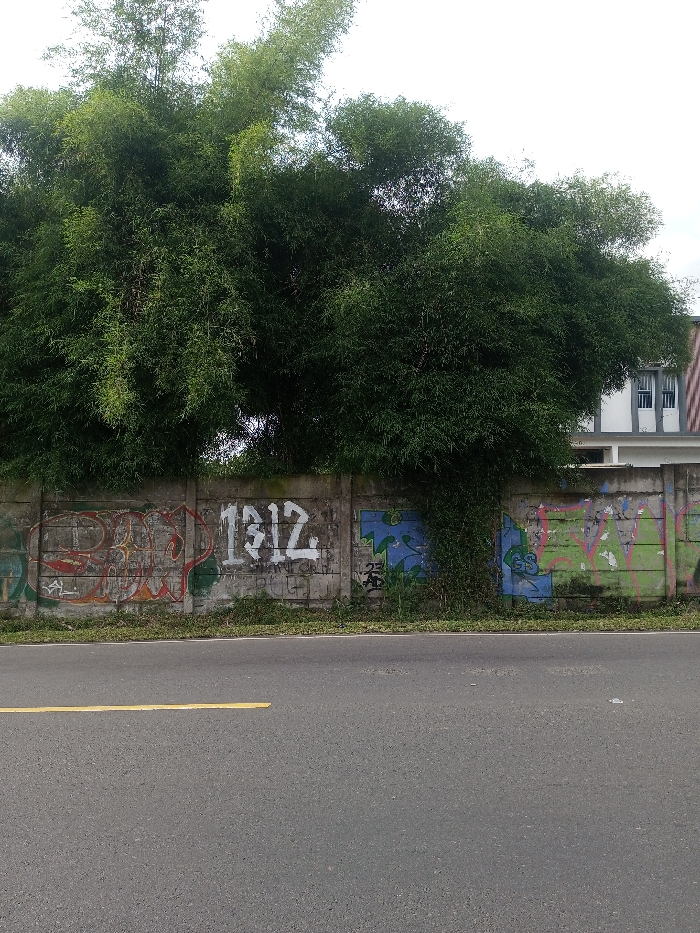 A concrete wall with graffiti faces a gray asphalt road marked by a yellow line. Overhanging the wall is dense green foliage, partially obscuring a building with visible windows and a striped awning. The graffiti varies, featuring numbers, abstract designs, and color variations. Grass and weeds grow along the base of the wall. The sky is overcast.