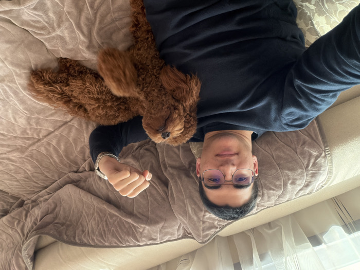 A young adult male, of light complexion with short dark hair and wearing thin-framed eyeglasses, is depicted in a selfie, lying in a supine position on a bed or sofa in Varna, Bulgaria. He is wearing a dark blue long-sleeved top. His left arm is bent, with his hand clenched into a fist and a silver-toned metal wristwatch visible on his wrist. He maintains direct eye contact with the camera, exhibiting a slight smile. Resting to his right, partially on his chest and the bedding, is a small, curly-haired, reddish-brown dog, consistent with a Poodle breed. The dog's head is tilted upward and away from the camera, eyes appearing closed. The subjects are positioned on bedding comprising a lighter cream or beige upholstered section and a taupe-colored quilted blanket featuring a distinct wavy pattern. A window with sheer, light-colored curtains is visible in the upper left background, indicating an indoor environment illuminated by natural light.