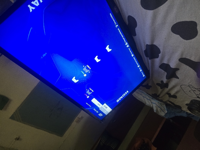 An indoor scene is captured from an angled, downward perspective. A flat-screen television, powered on and displaying a blue video game menu, occupies the central and right portions of the frame. Visible text on the screen includes "HOME" (inverted), "CLASSIC," "DRIVE," and partial menu options such as "Change Control Method" and "Connect Online," alongside multiple white game controller icons. The television rests on a light-colored fabric surface patterned with irregular, dark, blob-like shapes. To the left of this surface, a section of blue and white striped fabric is visible. The upper-left background reveals a light-colored wall and ceiling, with a dark, rectangular panel or vent affixed to the ceiling. No individuals are present in the image. The specific location within Jos, Nigeria, cannot be determined from the visual evidence.