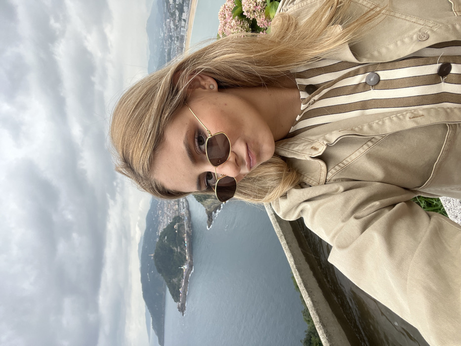 A female individual with long blonde hair, wearing gold-framed sunglasses, a tan trench coat, and a vertically striped brown and beige shirt, is depicted in a close-up selfie