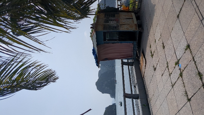 The image depicts a waterfront scene in Hong Gai Ward, Vietnam, under a clear, bright sky. In the foreground, a paved stone-tiled area, with weeds growing between the tiles, extends across the bottom. A small, light blue and brown dilapidated shack, appearing to be constructed from corrugated metal and wood, stands to the right of the frame, elevated slightly on dark supports. The shack has multiple windows, some boarded or covered, and a pink fabric curtain hangs over an open doorway on its left side. A blue tarp partially covers its roof. To the left of the shack and extending across the midground, a concrete barrier or railing separates the paved area from a body of water, likely a bay. The water's edge shows some small rocks or debris. Several boats, including a small motorboat, are visible on the water. In the background, numerous large, dark green limestone karst islands rise dramatically from the water under a hazy sky, characteristic of Ha Long Bay. Overhead, dark green palm fronds partially obscure the upper corners of the image, framing the scene. No individuals are present in the photograph.