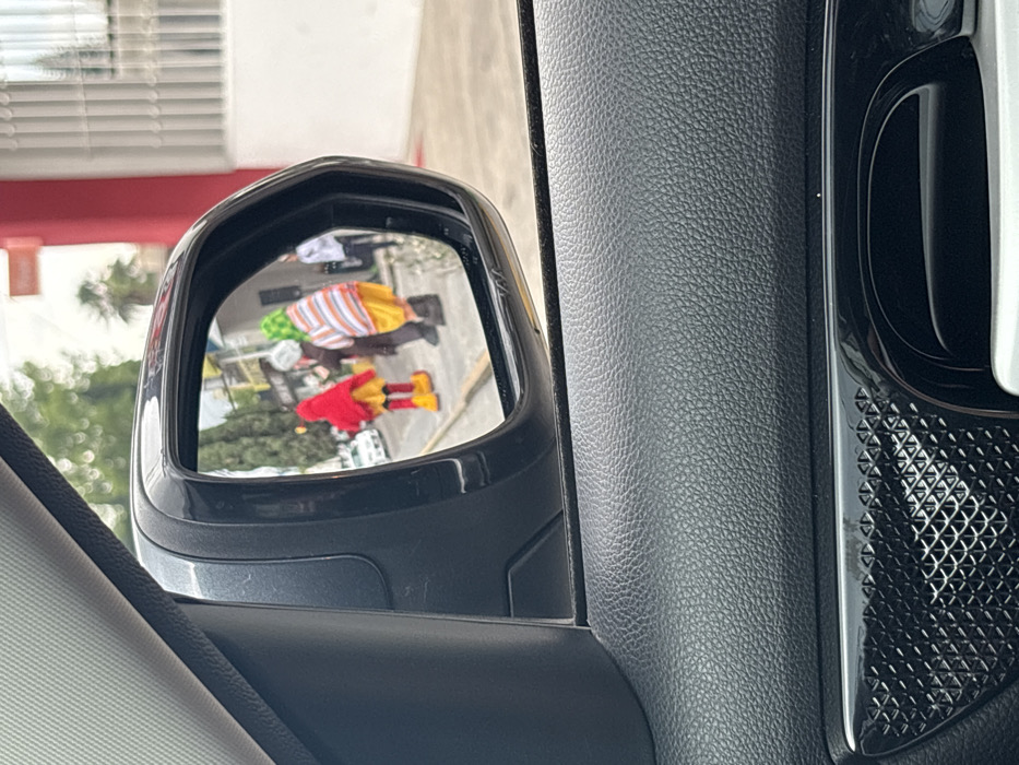 A car's side mirror reflects an outdoor scene. The reflection shows two people in clown costumes, one in a red outfit and the other in a striped shirt with a green hat. The background appears to be a street with buildings and some greenery. The image is taken from inside the car, with the textured interior of the door visible on the right. The car door panel features a pattern and a glossy black handle.