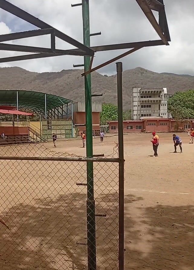 baseball game being played on a dirt field, as viewed from behind a chain-link fence and under a metal frame structure. Several players are dispersed across the field, some wearing red and yellow, while one is in blue. In the background are low buildings and a larger white building, nestled in front of a green, hilly mountain range under a cloudy sky. The camera pans slightly to the right.