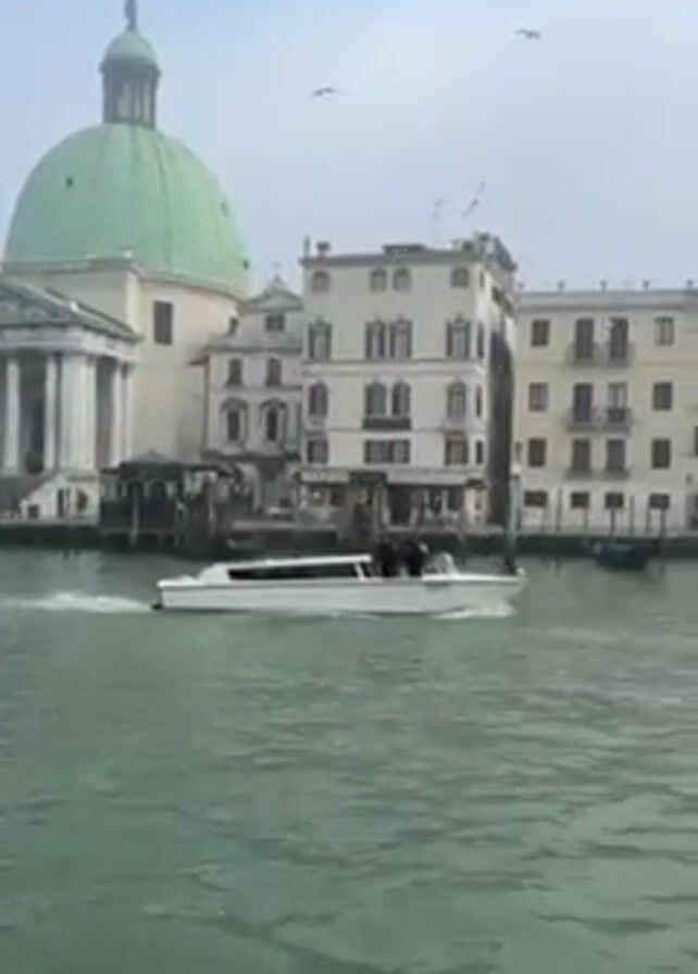 canal in Venice on a foggy day. In the background is a building with a green dome. A white boat is traveling on the canal, and there are several seagulls flying above. A water bus stop is seen on the right with people waiting there.