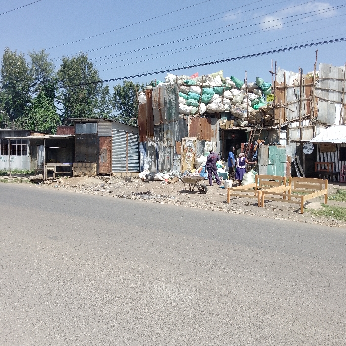 This image captures a roadside scene in Nkaimurunya ward, Kenya, featuring multiple structures and individuals under a clear blue sky. The central focus is a multi-story building constructed from corrugated metal sheets exhibiting rust and varied textures, reinforced by external wooden scaffolding. The upper sections and roof of this building are heavily laden with numerous large, bulging sacks, primarily white with some green, suggesting storage of materials like recyclables. A wooden ladder leans against this structure, with one person visible ascending it towards the sacks. At the ground level entrance of this main building, several individuals are gathered; one person is dressed in a dark uniform, another in a white top and dark skirt. A metal wheelbarrow containing loose debris sits on the dirt ground in front of the entrance. To the left, a series of smaller, single-story structures made of corrugated metal and other basic materials line the roadside. To the right, two unfinished light-colored wooden benches are positioned on the ground, likely for sale, in front of another smaller corrugated metal structure. The immediate foreground features a paved asphalt road. The ground between the road and the structures is an unpaved area of dirt and gravel, littered with scattered debris, including plastic bags. Overhead, multiple parallel power lines stretch across the frame. Green trees are visible in the background on the left side of the image.