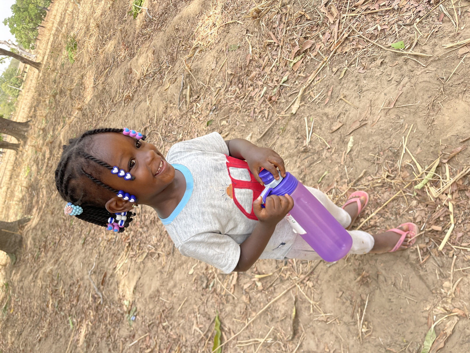 The scene depicts a young child standing outdoors in Akwanga, Nigeria. The child, appearing to be of African descent, is positioned centrally, looking towards the viewer's right with a smiling expression. The child's dark hair is styled in multiple small braids, adorned with numerous colorful beads in shades of blue, purple, pink, white, and green, some shaped as hearts or flowers. Attire consists of a light grey short-sleeved t-shirt with a light blue collar trim and a red graphic design on the chest, light-colored trousers or leggings, and pink flip-flops. The child holds a translucent purple water bottle with a darker purple lid in both hands at waist level. The immediate ground is dry, light brown soil, extensively covered with fallen brown leaves, dry twigs, and sparse dead vegetation. In the blurred background, several trees with minimal foliage and a distant, indistinct building structure are visible under bright daylight conditions.