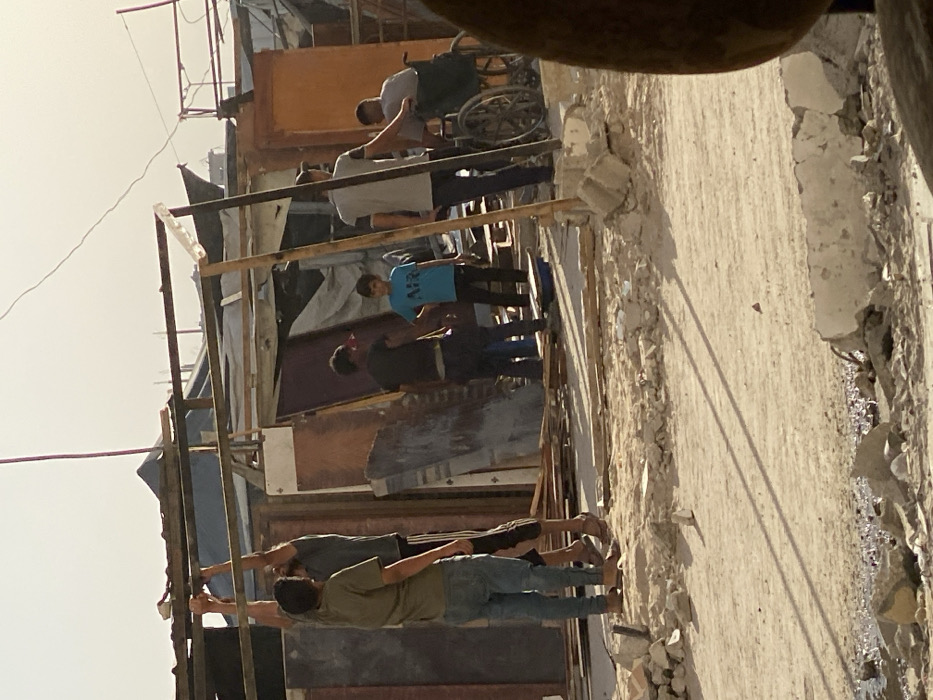 The image depicts an outdoor scene in al-Qarara, Palestinian Territory, under bright daylight. In the foreground, a dusty, uneven dirt ground is strewn with concrete rubble, small stones, and wooden planks. A small dark puddle or wet patch is visible in the lower left. In the midground, an open, rectangular wooden frame structure is prominent. Two adult males are actively engaged with this structure on the left side. One man, wearing a green t-shirt, blue jeans, and sandals, stands facing right, his hands extended upwards holding a horizontal beam. Another man, wearing a dark t-shirt with white stripes on the sleeves and dark pants/shorts, stands facing left, also holding the same beam, assisting the first individual. To the right of these two, two young males are standing. One, wearing a dark t-shirt and dark pants, stands with his back partially turned. The other, wearing a blue t-shirt with "AIR" text and dark pants, stands facing forward with hands on his hips. A blue plastic tray or container is on the ground near their feet. Further to the right, another adult male in a light-colored t-shirt and dark pants stands facing left, with his right arm extended towards a person seated in a dark-colored manual wheelchair. The person in the wheelchair, also wearing a light-colored t-shirt, is facing left, interacting with the standing male. In the background, behind the wooden frame, multiple makeshift structures or shelters are visible. These appear constructed from various salvaged materials including corrugated metal sheets, wooden panels (some painted in shades of orange and brown), and tarpaulps. Power lines or wires are visible against the clear, light sky above the structures. A tall, thin pole extends vertically upwards from behind the central structure on the left. The scene is illuminated by strong sunlight, casting distinct shadows on the ground.