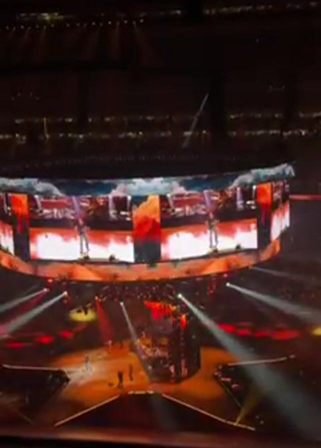 A wide shot captures a concert stage in a large, dark arena, with a band performing
