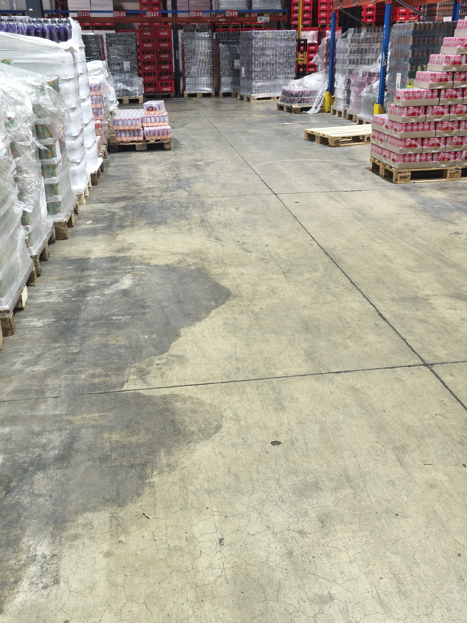 The image depicts the interior of a large warehouse, likely used for beverage storage. Pallets of drinks, many wrapped in clear plastic, are stacked along the perimeter, reaching significant heights. The floor is concrete with visible wear and stains, suggesting heavy use. The warehouse shelves are numbered from 125 to 130. There are no people visible in the frame. The location is in the city of Unknown, Unknown.