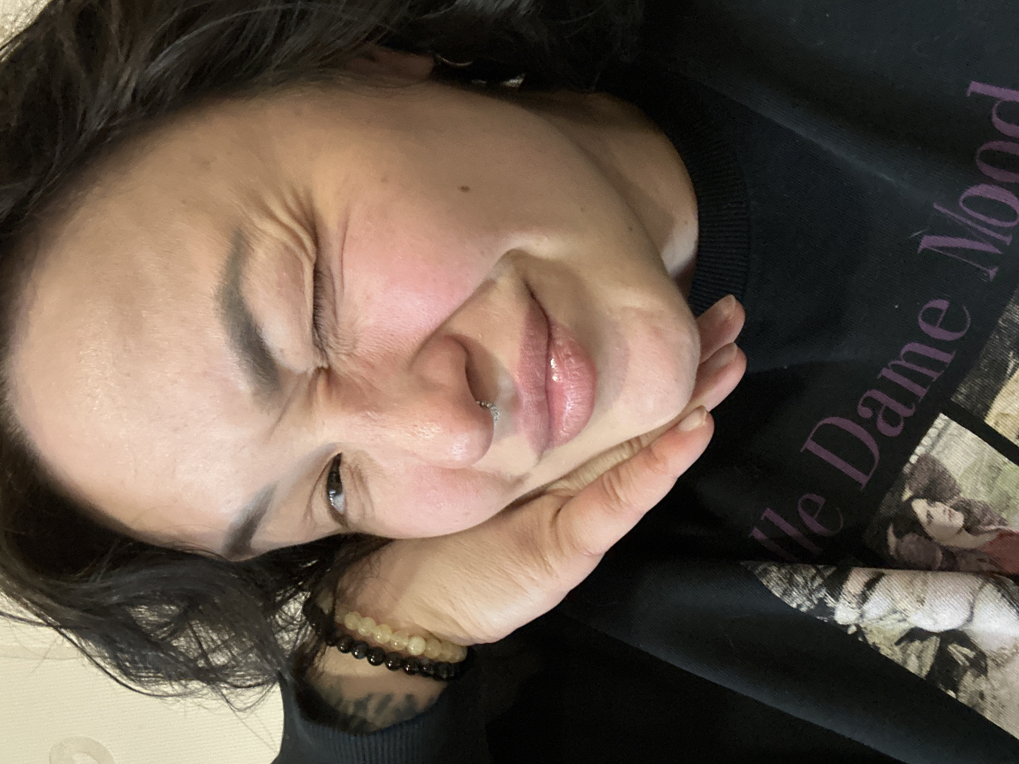 A close-up, slightly rotated image shows a person with dark hair and a black sweatshirt. The person's face is partially squished against their hand, with one eye closed in a squint. They are wearing a nose ring. A beaded bracelet is visible on their wrist. The sweatshirt has some light-colored prints and some purple text. The image has no other visible context to determine the location in the city of Chaikovsky, Russia.