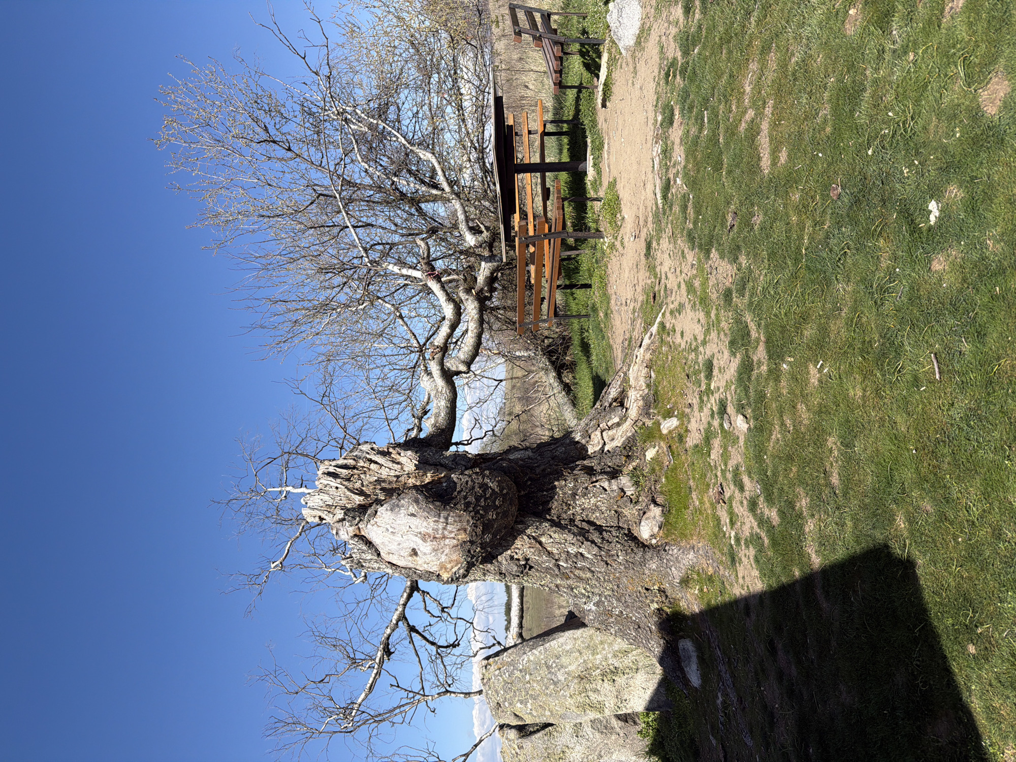 The image depicts a bare tree with a large burl on its trunk, situated in an outdoor setting in Plana, Bulgaria. The tree stands on a stone base, with a clear blue sky visible above. To the right of the tree is a wooden picnic table and bench, and beyond that, a grassy area mixed with dirt. The light suggests it is a sunny day.
