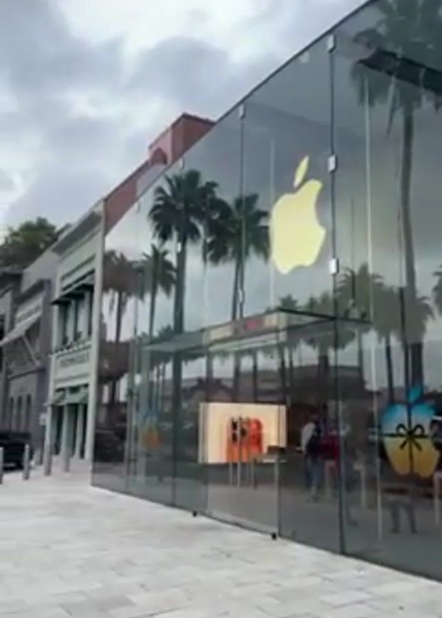 glass-walled Apple store, a row of shops, and a street lined with palm trees