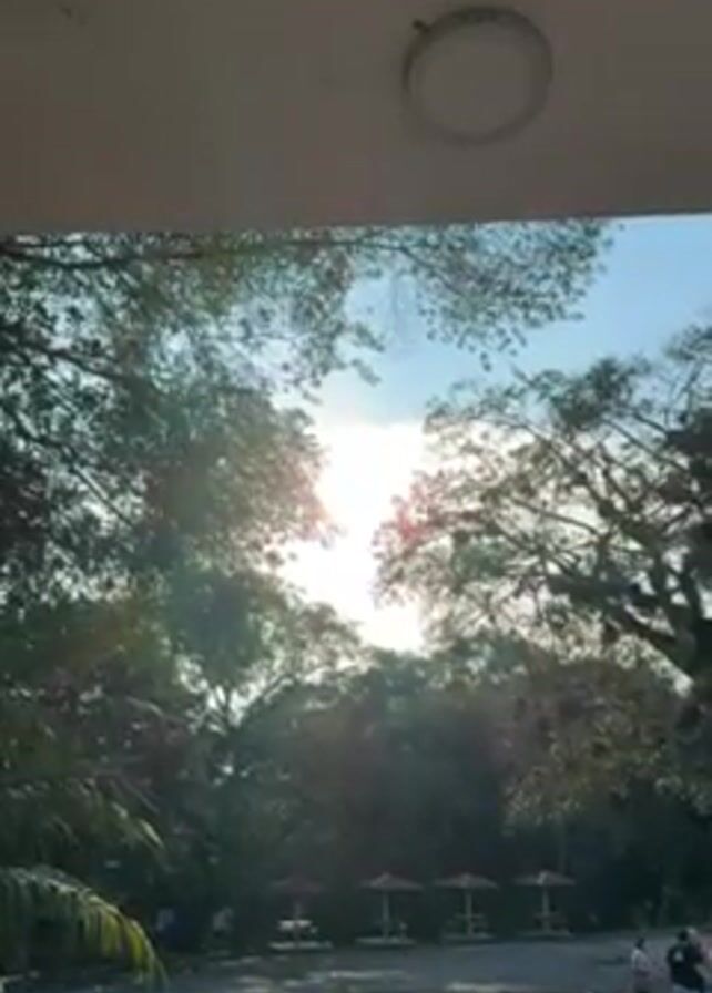 The scene appears to be outdoors, possibly a park or recreational area. The sun shines brightly through the branches of large trees, creating a somewhat dappled light effect. In the distance, picnic tables with red umbrellas can be seen. Several people are walking in the background, suggesting it is a public space. The view is framed by what seems to be a ceiling or overhang, possibly a building's entrance or a covered area. A circular light fixture is visible on the ceiling. The ground appears to be gravel.