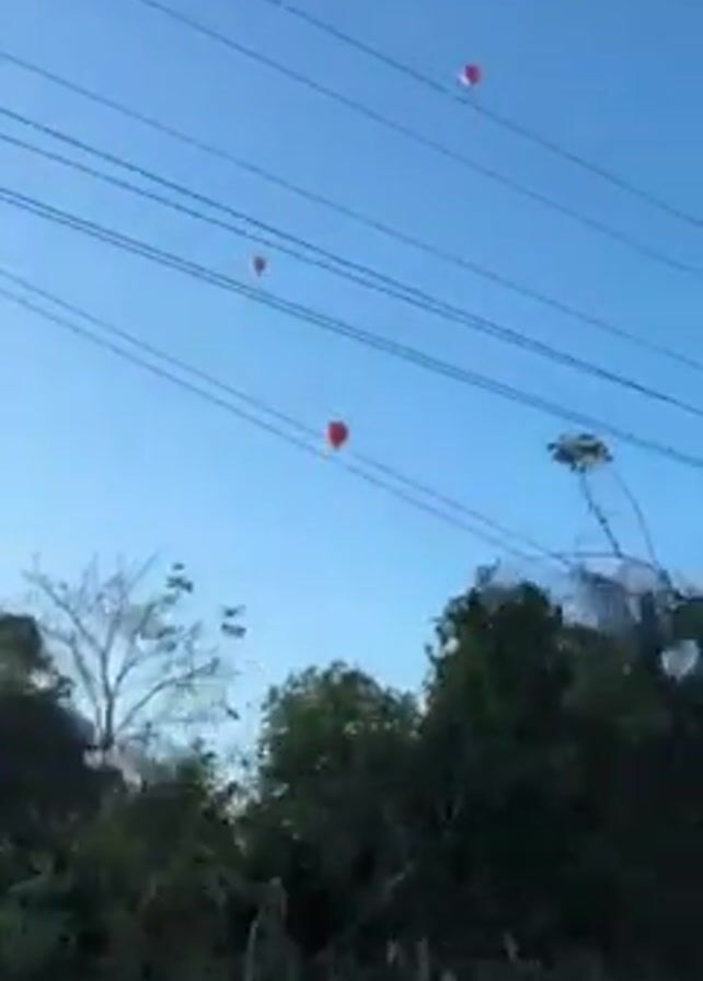 four small, orange hot-air-style balloons floating in the air. They appear to be at a distance and are seen against a clear blue sky with power lines running horizontally across the frame. The camera seems to be moving, capturing the balloons from a low angle. Below the balloons, there is a line of green trees and vegetation. A utility pole is visible on the right side of the frame. The overall impression is of a bright, sunny day in a rural or suburban area. A loud "whoosh" sound is heard early in the video.