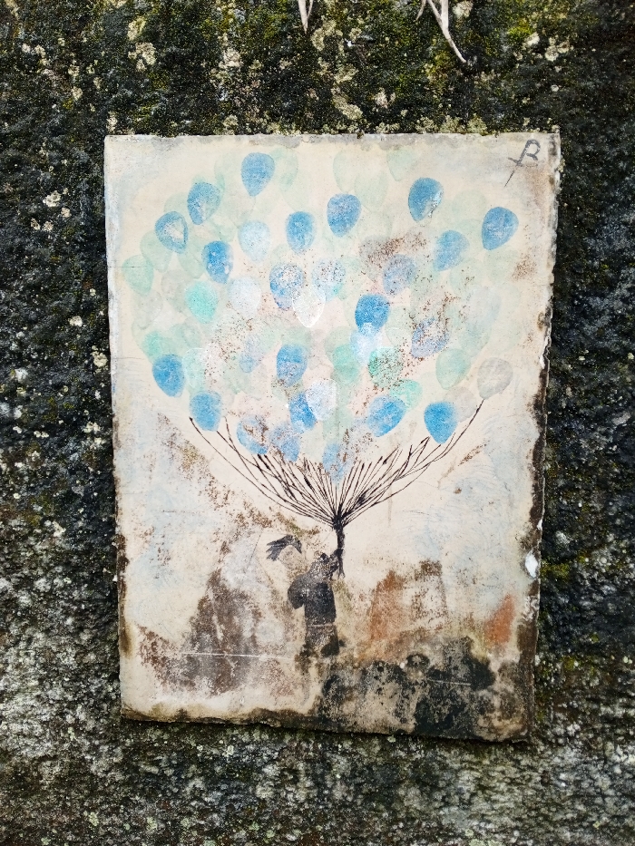 A vertically oriented rectangular art panel, measuring approximately 25cm in height, is positioned centrally against a dark green, heavily textured, moss and lichen-covered surface, likely stone or concrete. The panel itself features a light beige, off-white background with areas of brown and dark gray discoloration, particularly along its bottom edge. The artwork depicts a stylized, dark silhouette of a small figure situated near the bottom center, from which numerous thin black lines radiate upwards, converging into a large cluster of approximately 60-80 individual, irregularly shaped, teardrop or oval impressions. These impressions are rendered in various shades of light blue, teal, and white, resembling fingerprints or thumbprints, creating the appearance of balloons. A faint capital letter "B" and a small cross-like mark are visible in the upper right corner of the art panel. The panel's edges are irregular and appear weathered. The scene is located in the city of Voa Yeav, Cambodia.