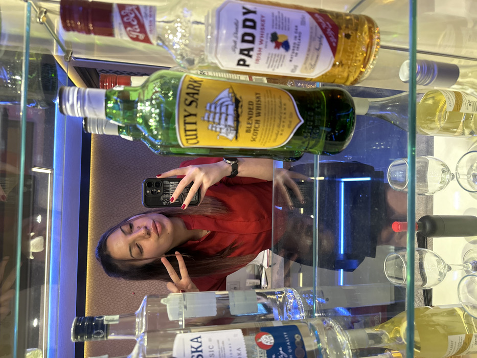 The image displays a reflection of a female subject, captured through a glass display case containing various alcoholic beverages, within an unspecified establishment in Plovdiv, Bulgaria