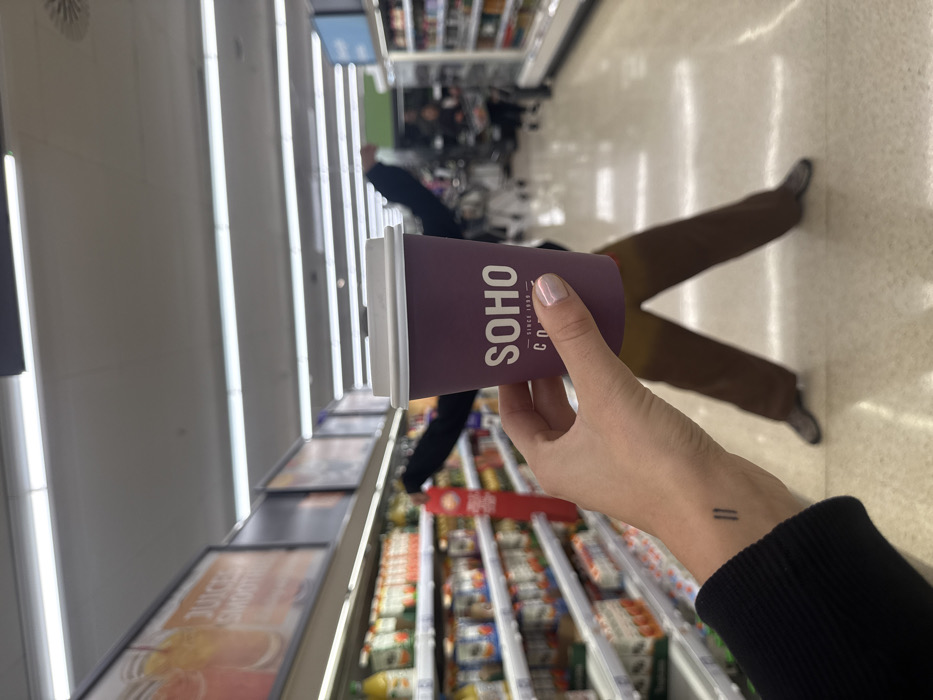 The image displays an interior view of a brightly lit grocery store or supermarket, located in London, United Kingdom. In the immediate foreground, a person's left hand holds a purple takeaway coffee cup with a white plastic lid. The cup bears the brand name "SOHO COFFEE" in white capital letters, with "SINCE 1999" inscribed below. The hand exhibits light pink nail polish on the fingernails, and a small, dark tattoo of two parallel vertical lines ("||") is visible on the wrist. A black ribbed sleeve of an article of clothing covers the lower forearm. The background reveals a retail environment with multiple aisles. To the left, a long aisle features shelves stocked with various packaged goods, predominantly beverages such as juices and smoothies, as indicated by an overhead sign displaying "JUICES SMOOTHIES." A red vertical promotional display is partially visible further down this aisle. To the right, another aisle with stocked shelves extends into the distance. The floor is light-colored and reflective, reflecting the illumination from numerous overhead fluorescent strip lights arranged in parallel rows on the white ceiling. Directly behind the coffee cup, a blurry individual is visible, wearing brown trousers and grey shoes, with their legs spread apart. The upper portion of this person's body is largely obscured by the cup, though dark clothing is discernible. Further down the right aisle, another indistinct figure, consistent with a shopper, is present. The specific supermarket chain or its exact location within London is not identifiable from the visible details.