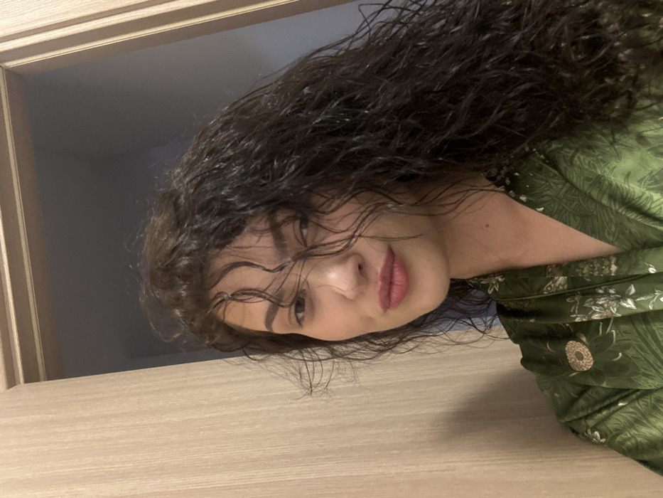 A woman with dark, wet curly hair is positioned at an angle against a light-colored door frame, peering into the camera. Her lips are tinted pink, and her eye is slightly visible behind strands of her wet hair. She is wearing a green silky patterned top. A glimpse of a dimly lit gray-blue room can be seen in the background.