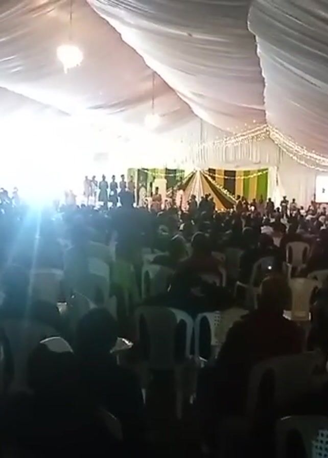The video depicts a large crowd gathered inside a tent-like structure, presumably for an event. The space is illuminated by bright overhead lights, and the ceiling is draped with white fabric. Rows of white plastic chairs fill the tent, occupied by a diverse audience of people of various ages and attire. At the front of the tent, a stage is visible, adorned with decorations in green, yellow, and black. There are several people standing on the stage, possibly performers or speakers. The audience appears attentive, with some individuals holding up their phones, likely to capture photos or videos of the event. A person in a light green safety vest is seen standing near the front of the crowd.