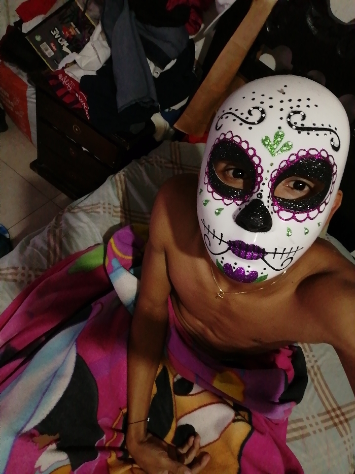 A shirtless person wearing a sugar skull mask is partially covered by a pink blanket with a cartoon character on it. The person is sitting on a striped bed. In the background is a dark wooden dresser with items piled on top, including clothes and a box. The mask is white with purple and green glitter details. The person's eyes are visible through the mask's eye holes.