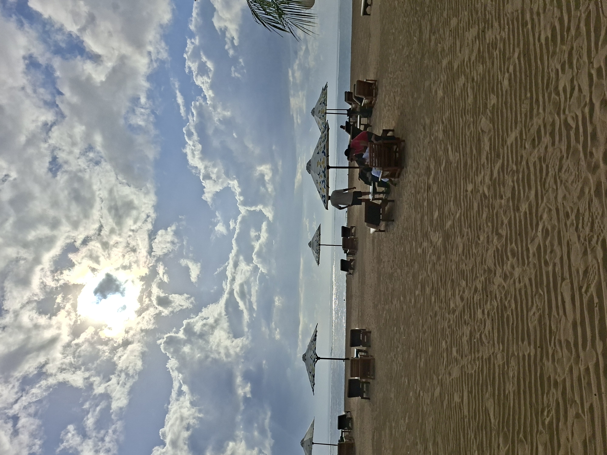 The image depicts a beach scene, likely in Denpasar, Indonesia, given the location context. The foreground is dominated by tan sand, exhibiting linear patterns suggesting raking or grooming. A row of beach umbrellas with patterned canopies extends from the bottom of the frame toward the horizon. Underneath these umbrellas are groupings of wooden chairs and tables, some occupied by people who are engaged in conversation or activities. The background features a sea or ocean horizon, with a sky filled with white and grey clouds, and a bright sun peeking through the cloud cover. A palm tree branch is visible in the upper left corner. The overall scene appears to be a tranquil beach setting.