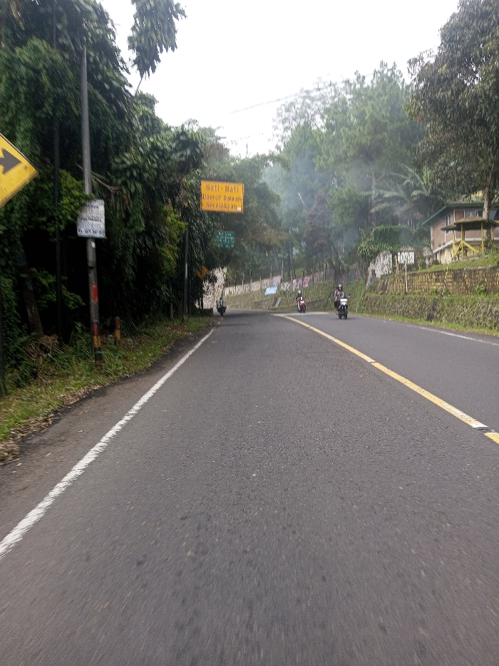 A paved two-lane road in Domphoog_Dungkarchhoeling, Bhutan, is depicted under an overcast sky. The road features a solid white line on its left edge, marking the shoulder, and a yellow centerline with alternating solid and dashed segments. Dense green vegetation, consisting of trees and foliage, borders the left side of the road, partially obscuring a dark utility pole. A yellow diamond-shaped sign with a black left-pointing arrow is partially visible on the far left. Further along the left side, a rectangular yellow sign with black text reads "Hati-Hati Daerah Rawan Kecelakaan" (Caution - Accident Prone Area), with a smaller, unreadable green sign beneath it. A dark-colored motorcycle is positioned on the far left shoulder, partially obscured by the yellow sign. On the paved road ahead, two motorcycles are visible, moving towards the viewer. The leftmost motorcycle is red and operated by a single rider wearing a helmet. The rightmost motorcycle is dark-colored (possibly black) and also operated by a single rider wearing a helmet. The right side of the road is defined by a stone retaining wall, behind which additional green vegetation grows. A building with a brown roof and light-colored walls is situated behind the wall and trees in the mid-ground. This building features an attached open-sided structure with a yellow frame. The distant background consists of dense trees and the faint outlines of hills beneath a hazy, light-gray sky.